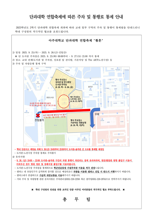 단과대학 연합 축제 중 주차 통제 / 도로 통제