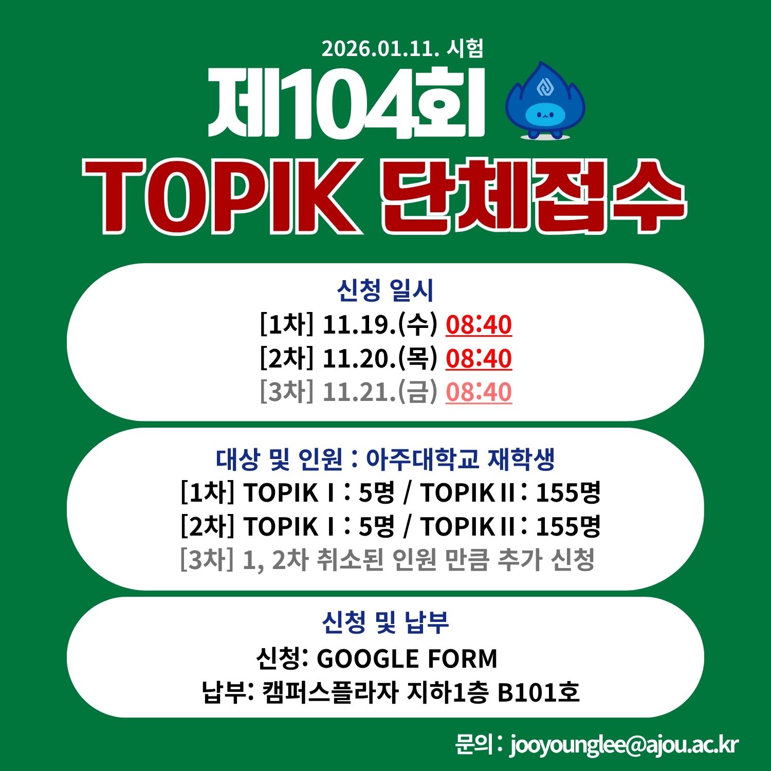 [공지] 제104회 한국어능력시험(TOPIK) 단체 접수안내(11.19~11.21)