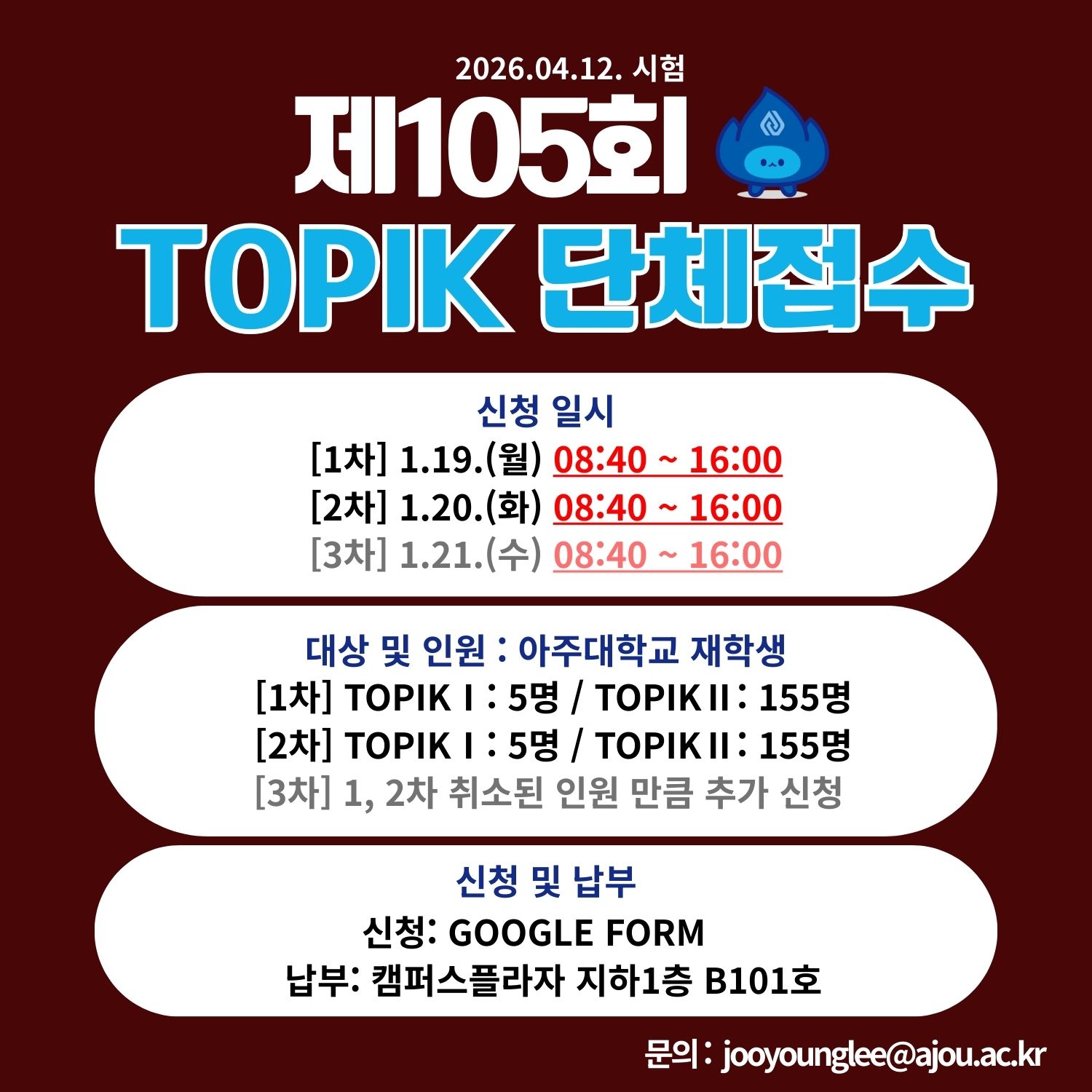 [공지] 제105회 한국어능력시험(TOPIK) 단체 접수안내(1.19~1.21)
