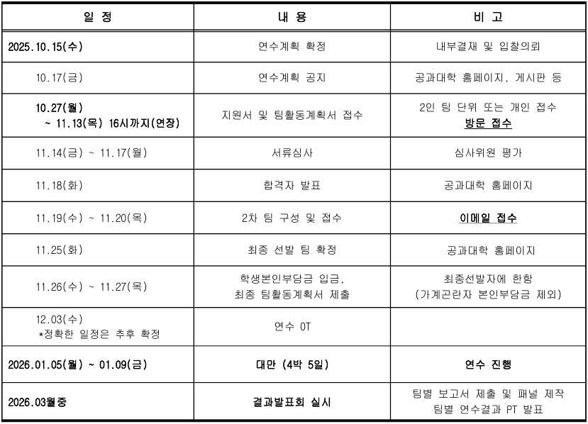 「공과대학 자기개발 해외연수」 프로그램은 연수일정을 사전공지 후 참가자를 모집하는 형태로 진행됩니다. 본인 스케줄을 확인하신 후 전체 일정에 참가 가능한 학생만 지원하시기 바랍니다.