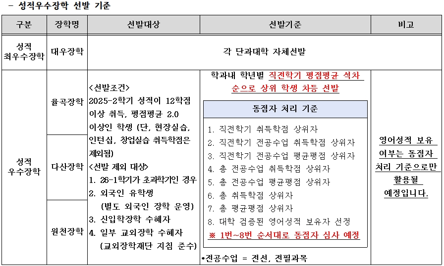 2026학년도 1학기 성적우수장학 및 기타장학 선발 안내