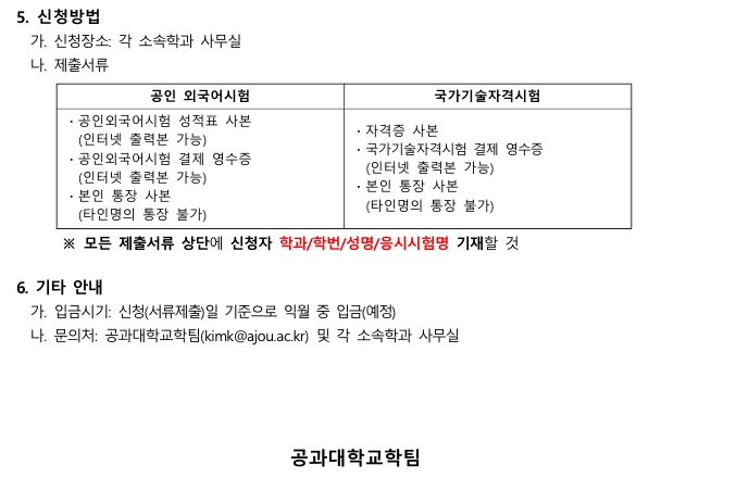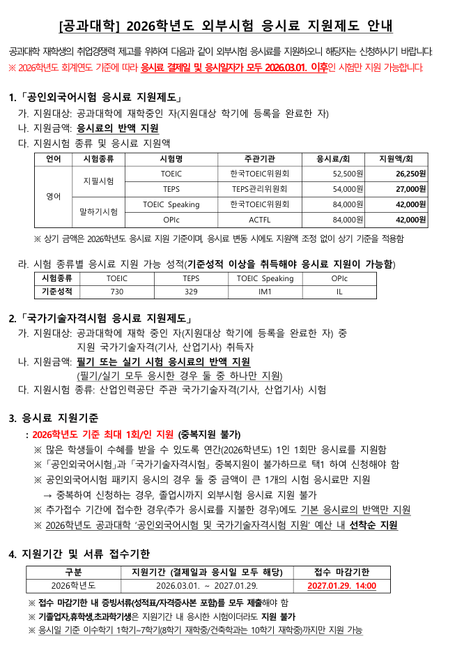 [공과대학] 2026학년도 외부시험 응시료 지원제도 안내