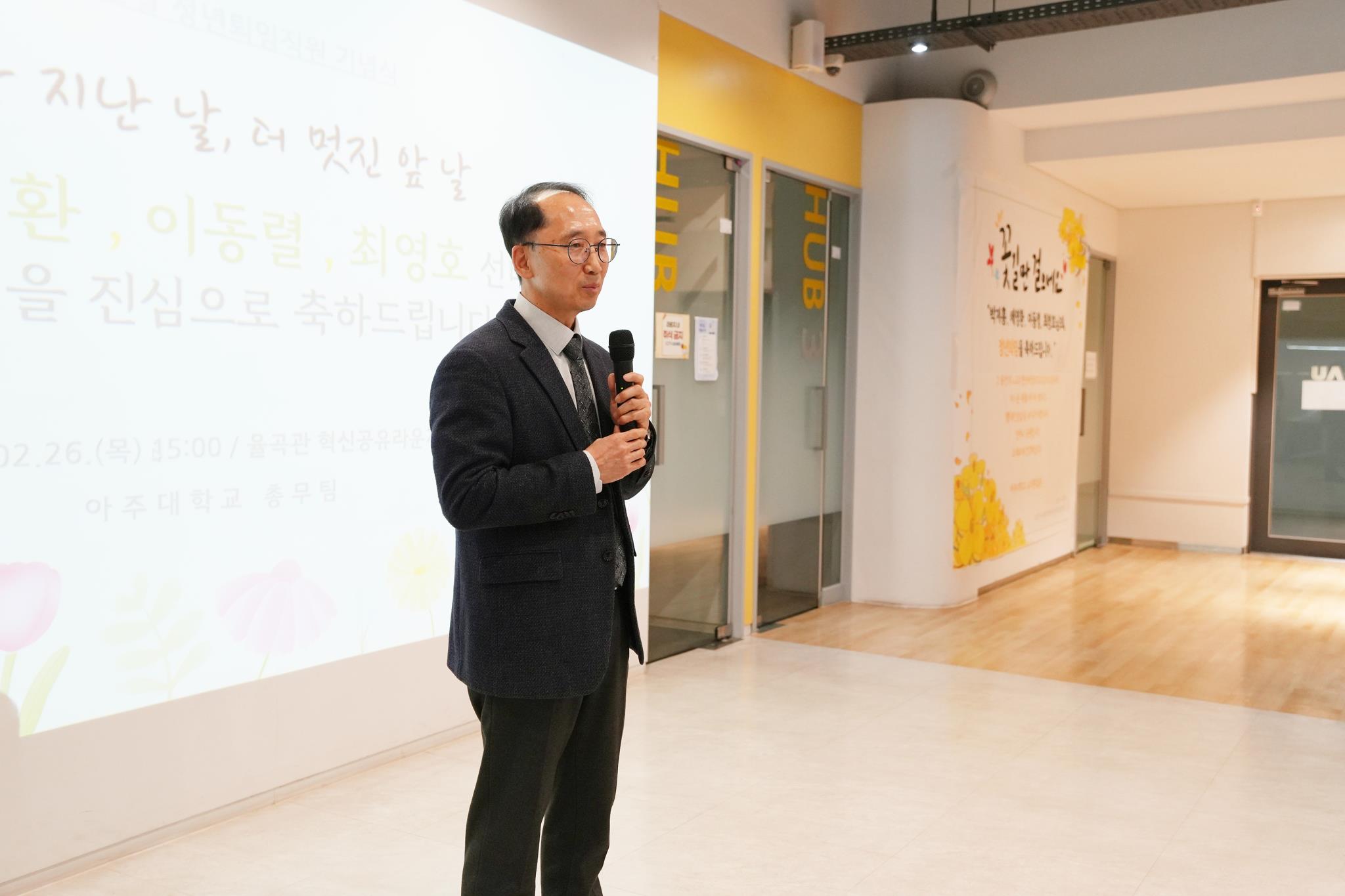26일 율곡관 지하 혁신공유라운지에서 진행된 행사에는 올 2월 정년을 맞이하는 4인의 직원과 최기주 총장을 비롯한 아주 가족들이 함께 자리했다. 최중원 회장을 비롯한 총동문회 관계자들도 참석해 축하를 전했다.