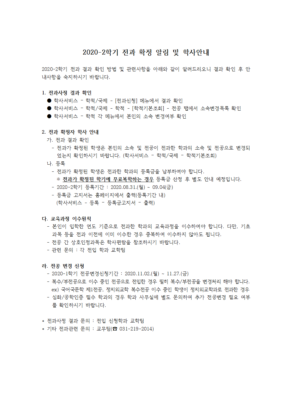 [학부]2020-2학기 전과 확정 알림 및 학사안내