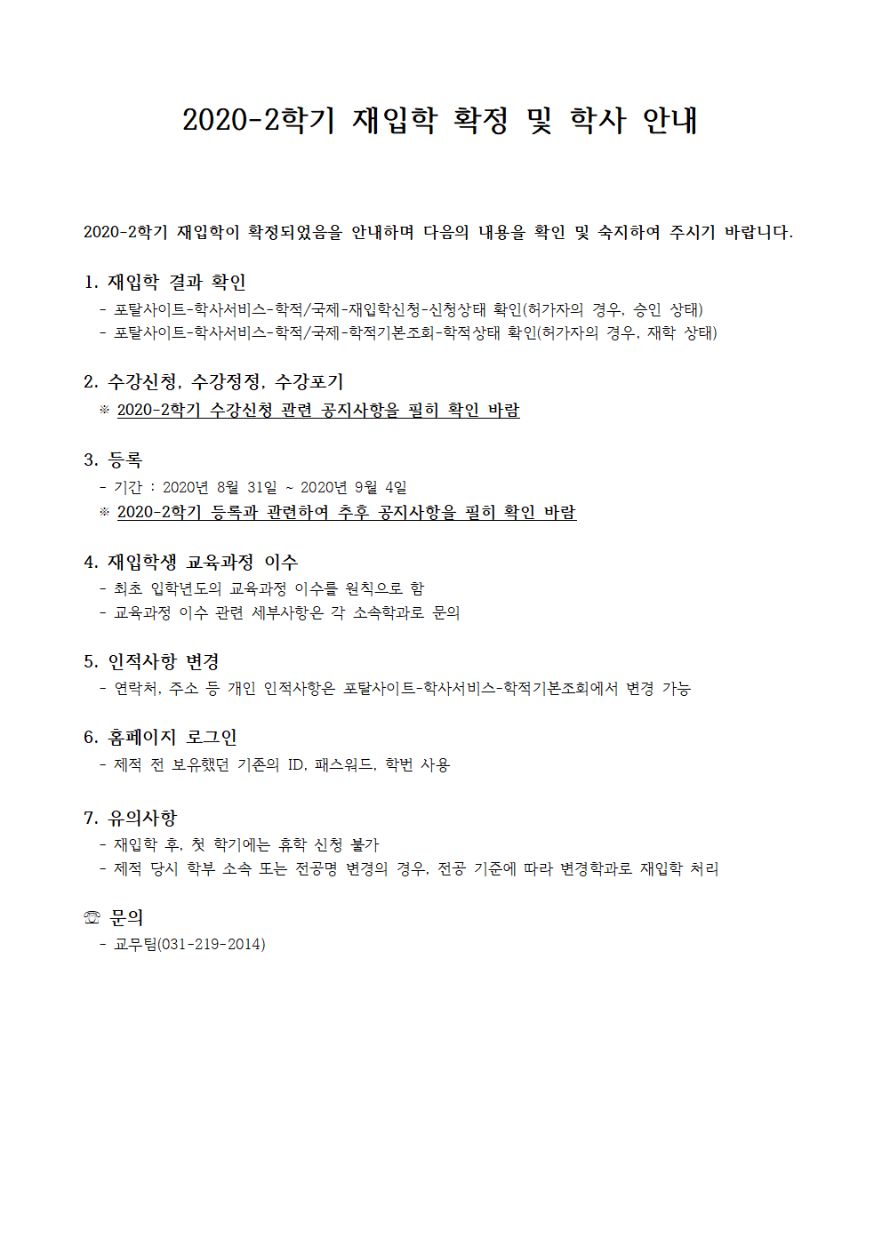 [학부]2020-2학기 재입학 확정 및 학사 안내