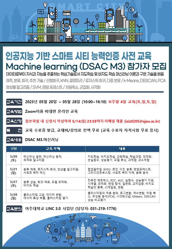 [추가모집][LINC 3.0] (전액무료) 인공지능 기반 스마트 시티 능력인증 사전교육3 (DSAC M3 자격과정) 참가자 모집(~5/16까지)