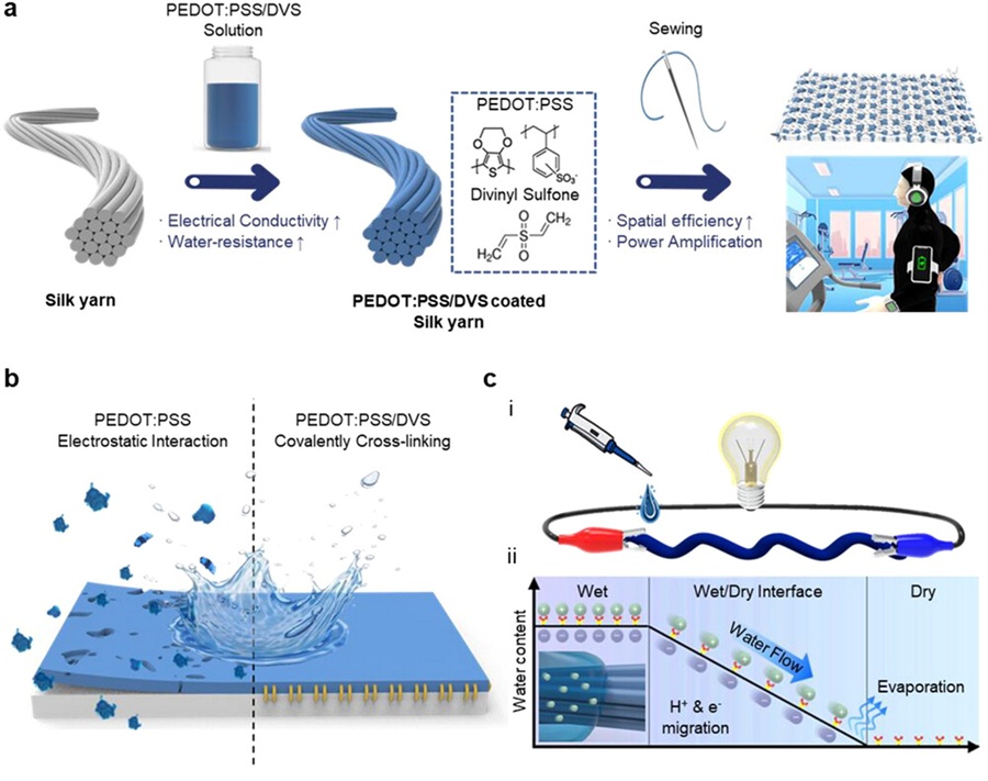 전도성 고분자인 PEDOT:PSS 소자는 음전하를 띄는 PSS 덕분에 양이온 흡착이 가능해 전기 생산 성능을 극대화할 수 있지만 PSS의 친수성 때문에, 수분에 대한 안정성이 낮다는 한계가 있었다. 이에 연구팀은 가교제로 사용되던 EG(Ethylene glycol, 에틸렌글리콜) 대신 DVS(Divinyl sulfone, 디비닐술폰)을 사용해 수소결합보다 강력한 공유결합이 가능함을 확인했다.